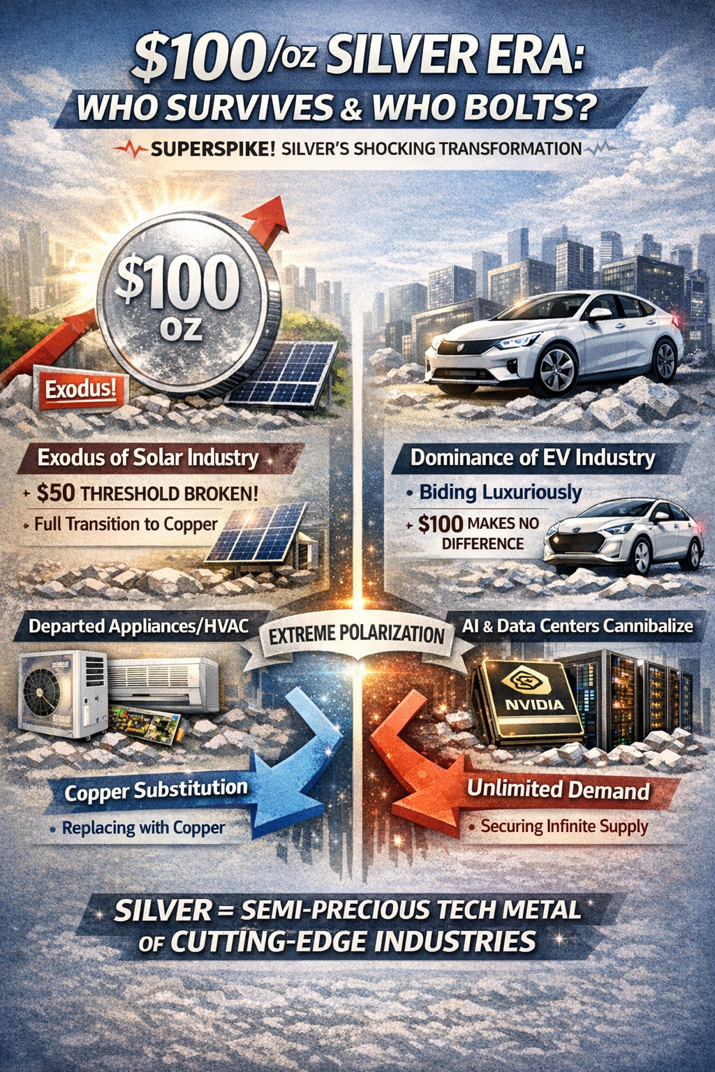 The era of $100 silver has arrived. Facing a historic "super spike," industry-specific endurance thresholds have either collapsed or shifted into an entirely new dimension. This report documents the massive qualitative transformation of the silver market, driven by the "exodus" of the solar industry and the emerging "monopoly" of the AI and EV sectors.