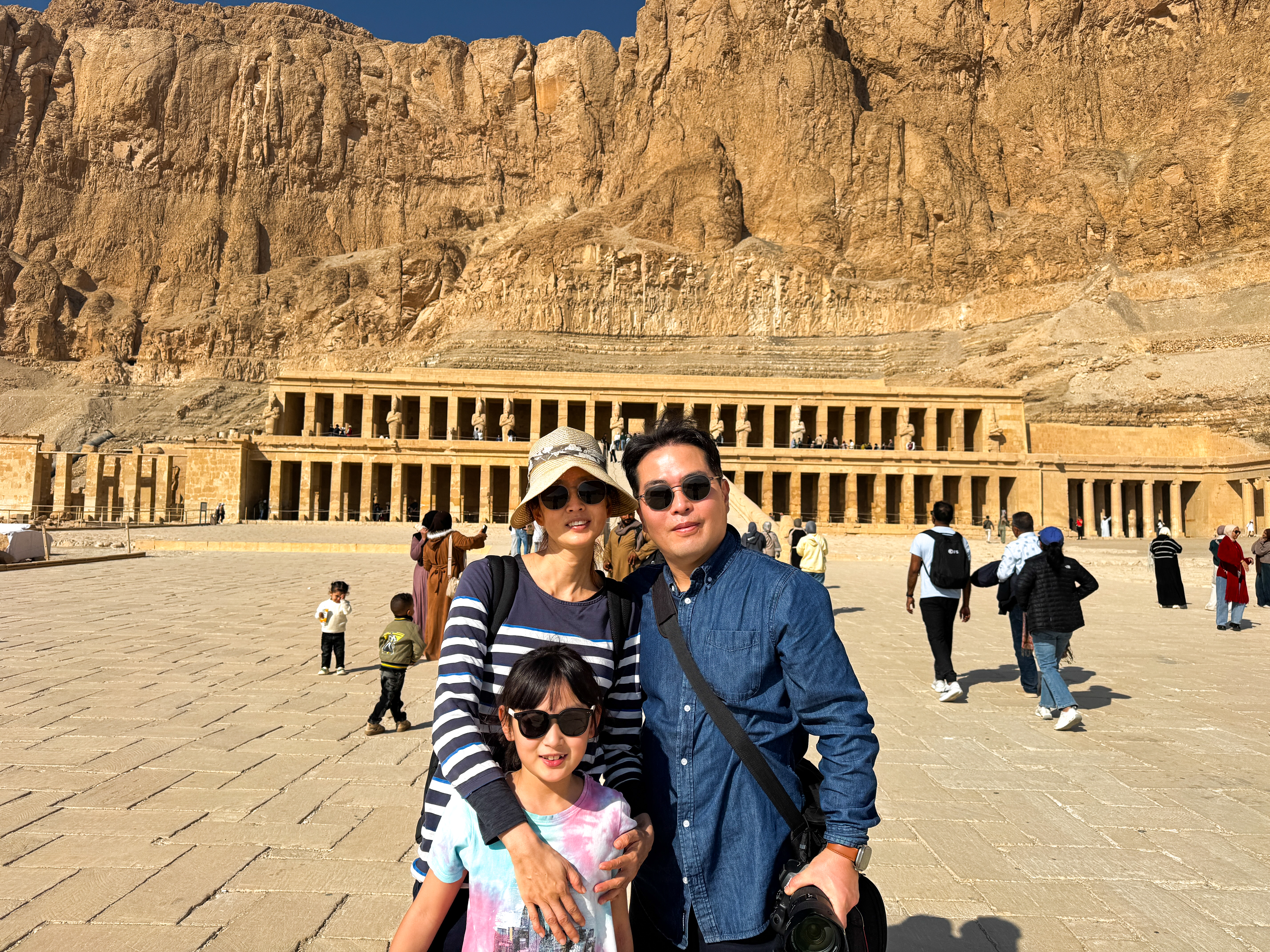 While purchasing tickets at the counter, a group of about 100 schoolgirls on a field trip stared at our family with curiosity. At first, they shyly greeted us from a distance, but soon they approached one by one, asking to take photos together. Among us, my daughter Yese was undoubtedly the star of the show for these Egyptian girls. Perhaps an East Asian child seemed so curious and pretty to them; the girls lined up as if they were meeting a celebrity to take a photo with her. Many even left a shy kiss on Yese's cheek after the photo. Their curiosity-filled smiles and warm hospitality felt as though they would linger in my heart much longer than the overwhelming grandeur of the temple itself.